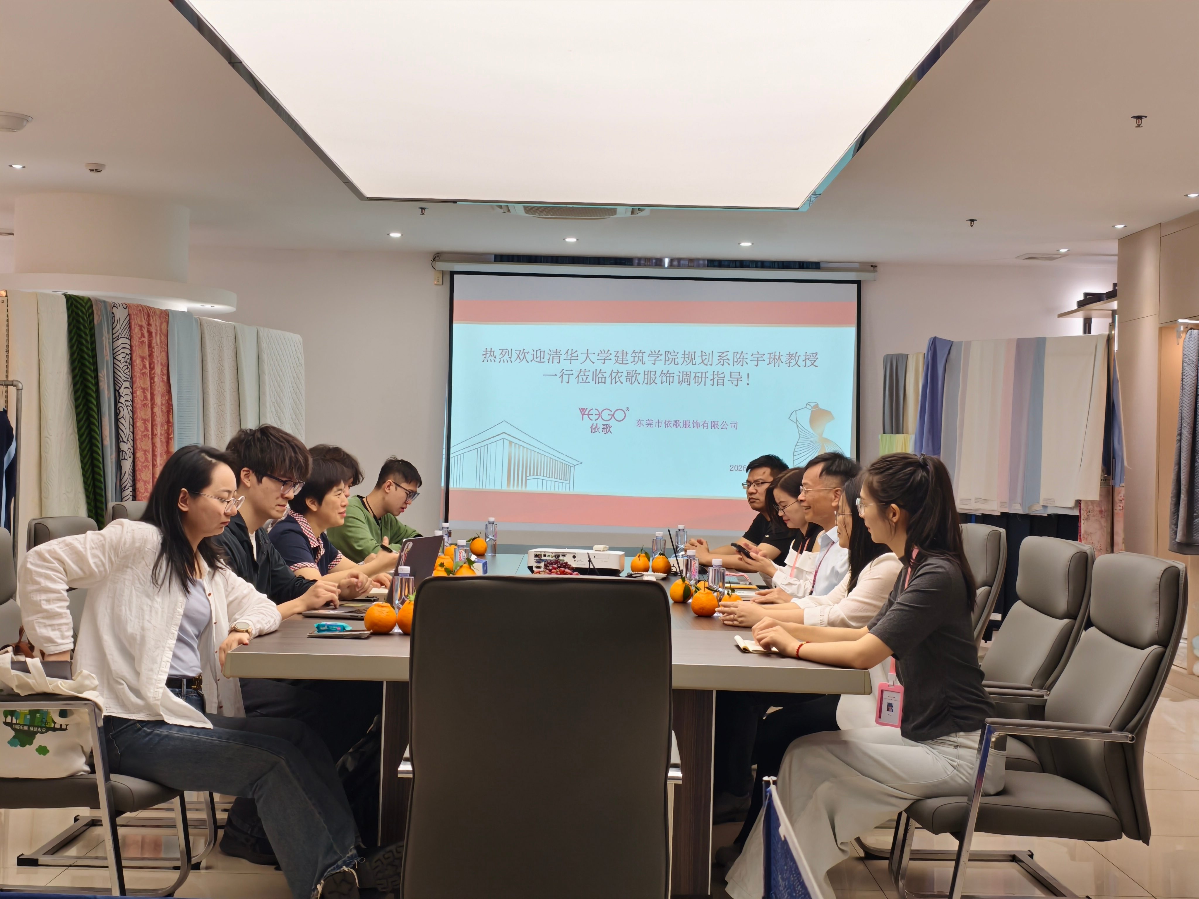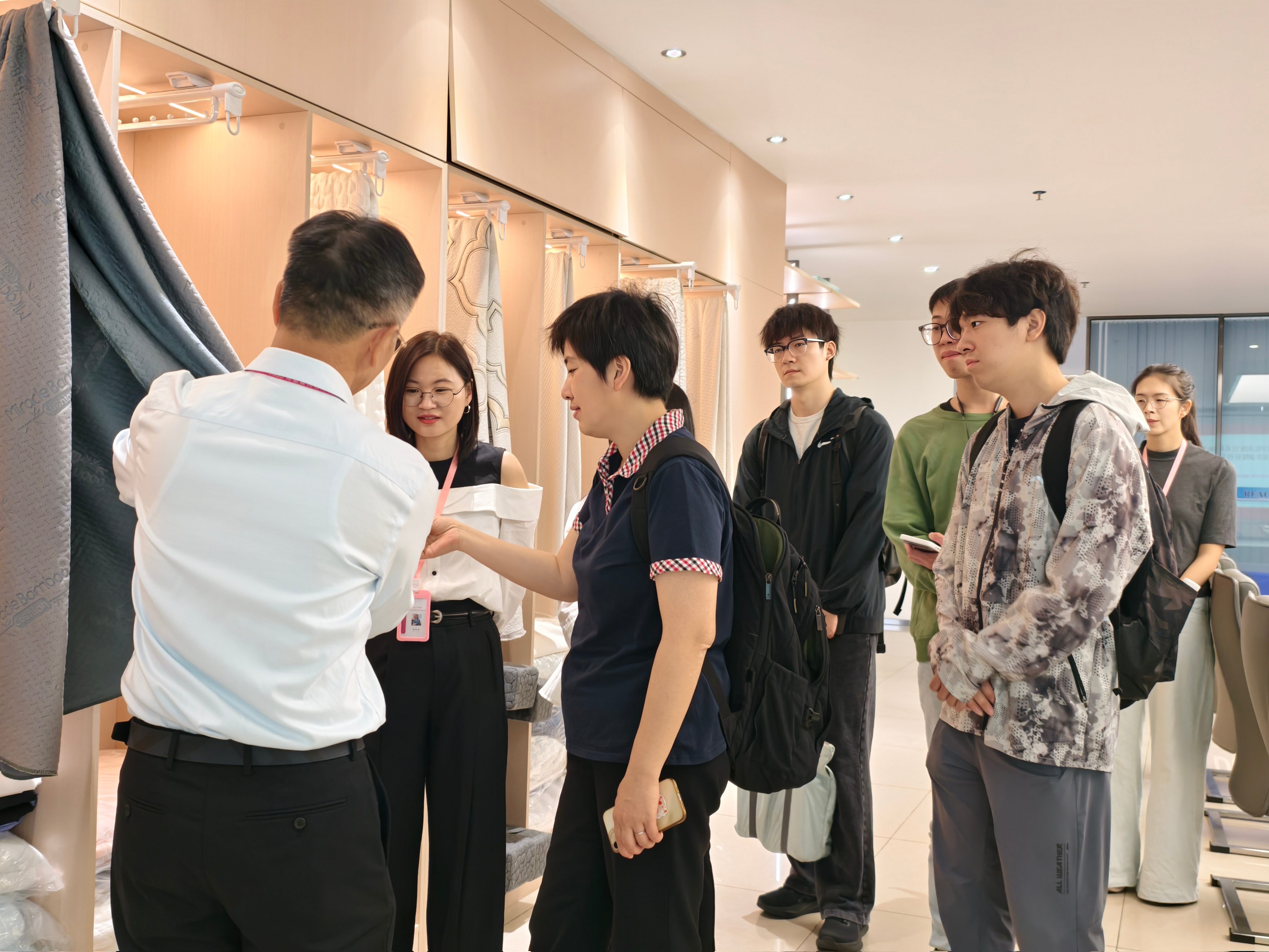 座谈交流环节,陈教授深入了解我司业务布局、核心成果后,对我司在全国专卖店网点合理布局、面料研发、时装款式设计以及寮步和茶山两个厂区工厂店生意火爆相当赞赏,并结合自身研究经验,为我司后期展厅升级设计、工厂新地块规划、设计网红打卡点提供了宝贵意见。